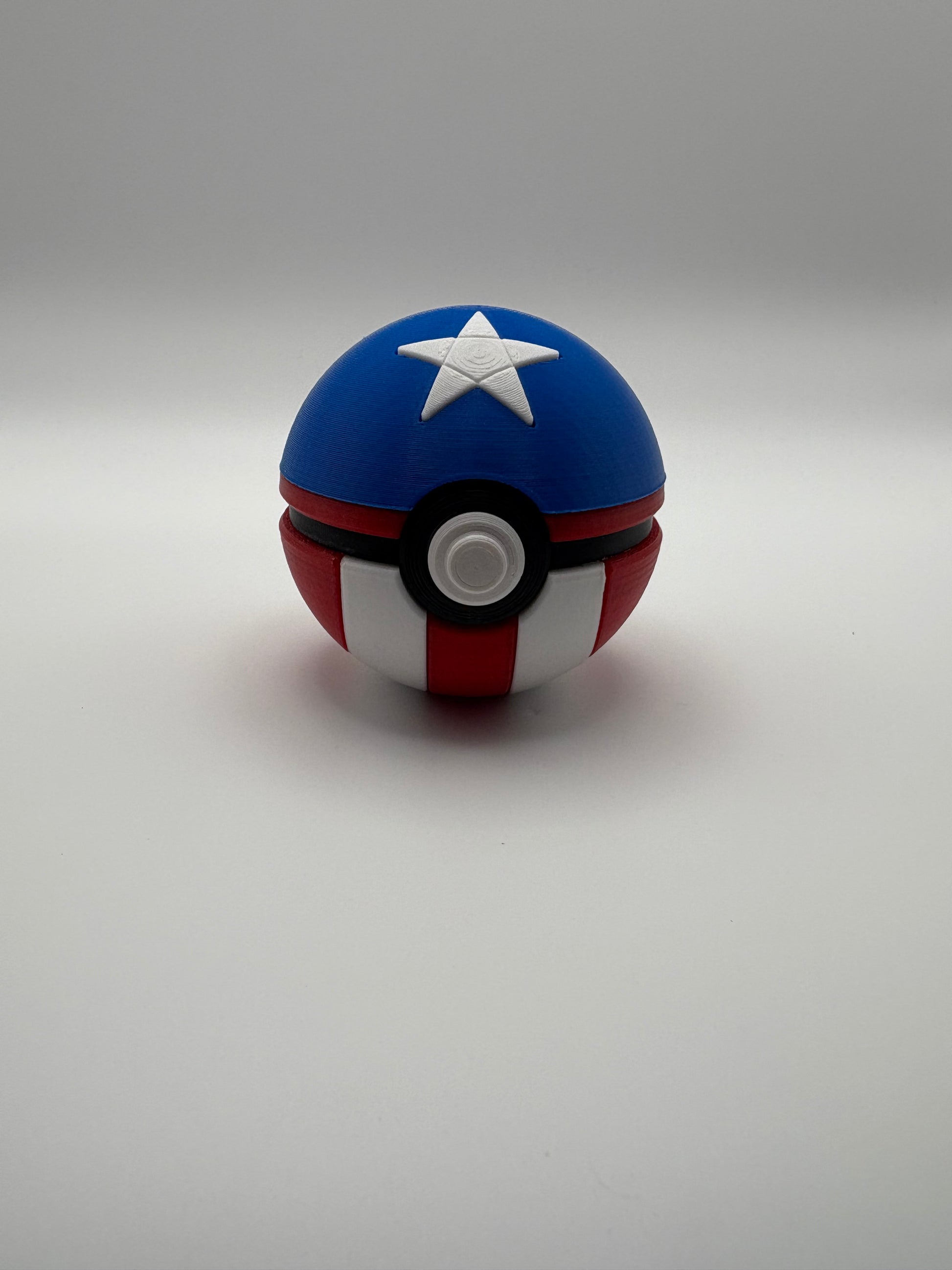 "Calling all superhero trainers! Unleash your inner Captain America with this epic themed pokeball. Featuring a clicker button for added excitement. Catch 'em all with a touch of patriotic power. (No shields required)."