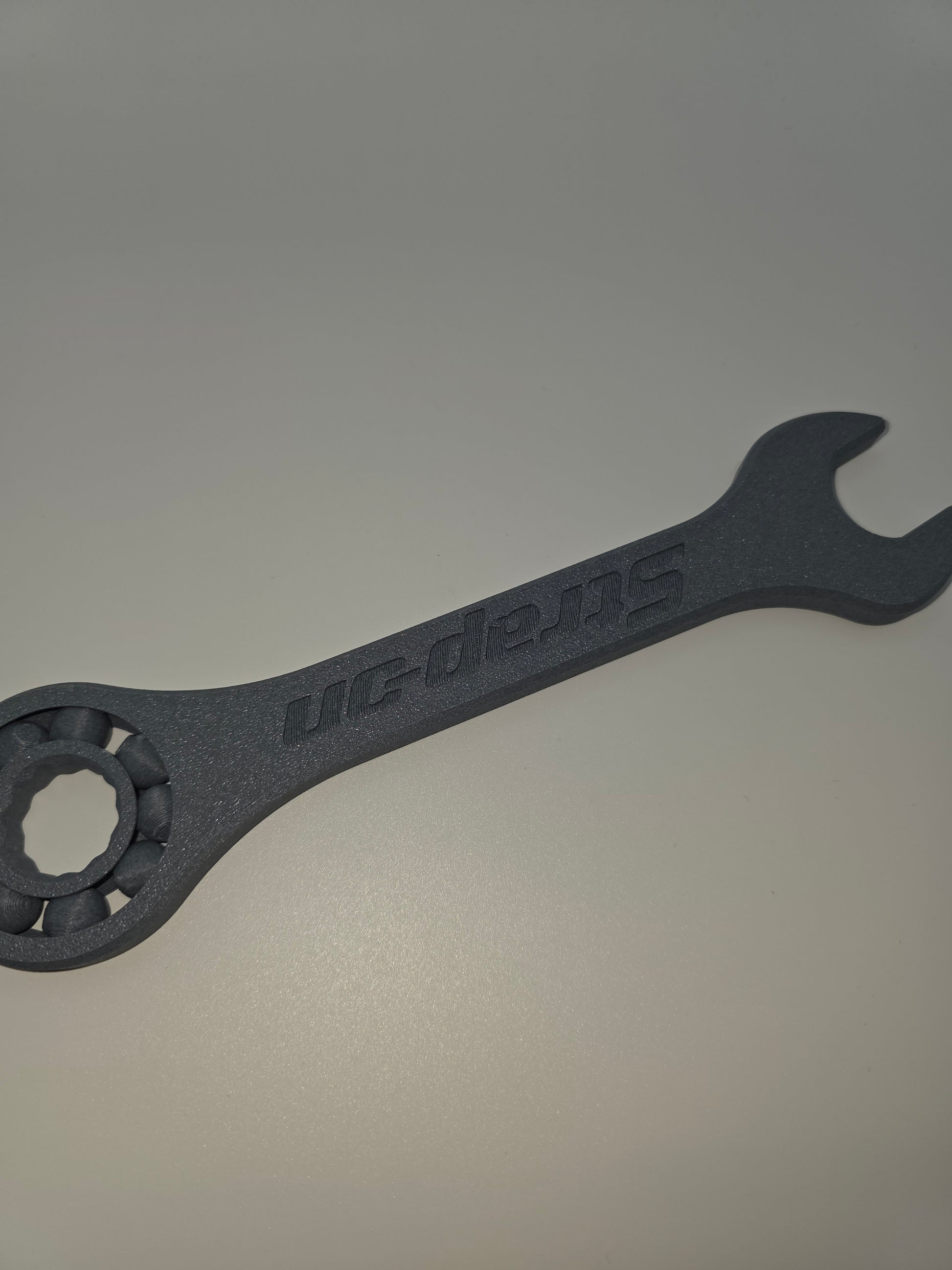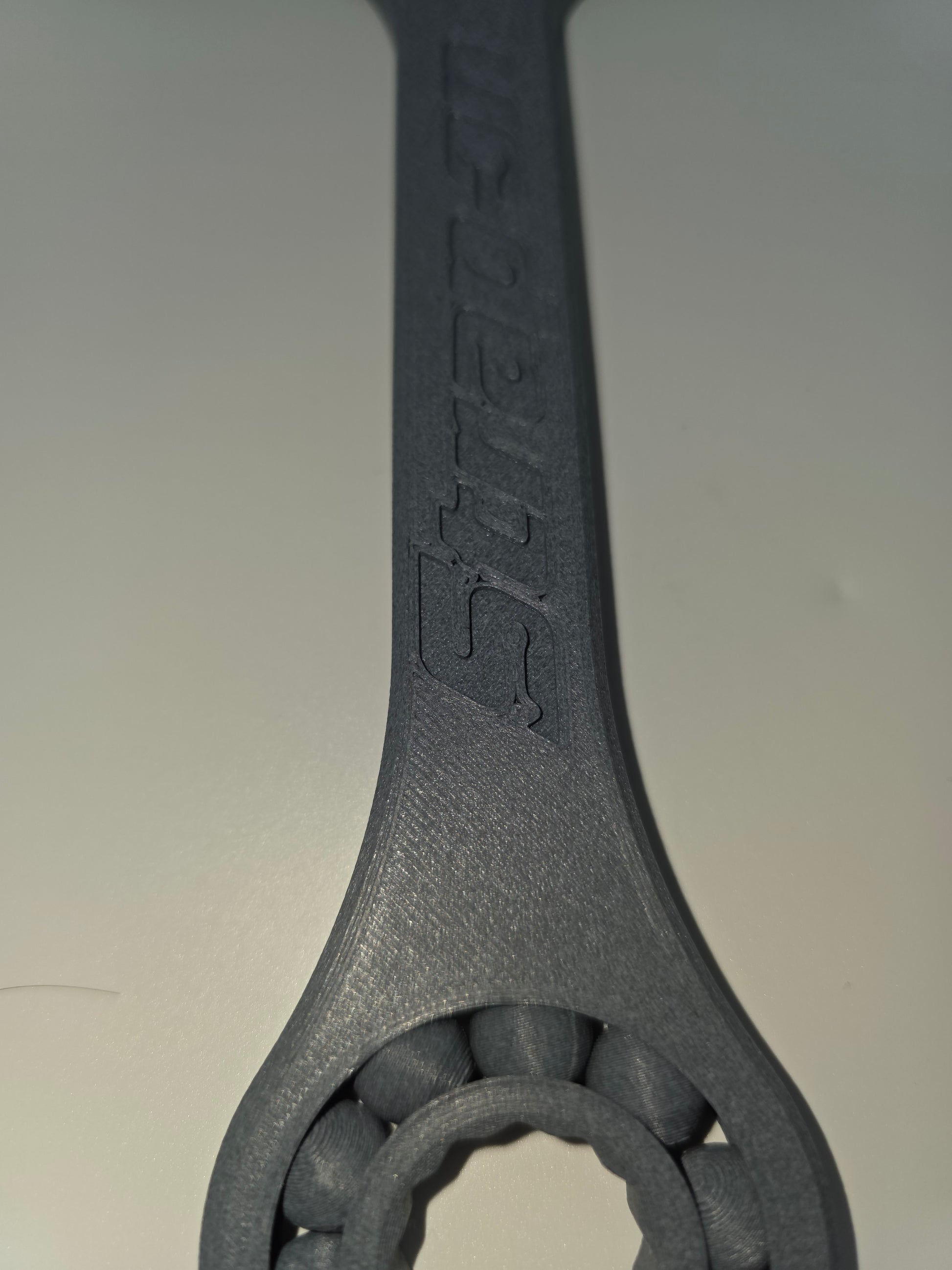 "Get your hands on this unique 3D-printed carbon fiber spinner wrench! With a playful nod to its design, this fidget toy features a realistic wrench appearance and even says "strap on". Perfect for those who enjoy a little humor with their stress relief. (Warning: may cause uncontrollable giggling.)"